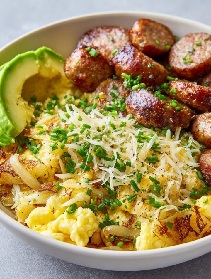 - The Art of Assembly: Get out four meal-prep containers or bowls. Start with a hearty base of crispy hash browns. Next, layer on a generous scoop of cheesy scrambled eggs. Top with slices of the savory sausage. Finish with fresh avocado slices and a sprinkle of chopped chives or green onion. Meal Prep Pro Move: If you’re making these for the week, let all components cool completely before putting the lids on to avoid steam making everything soggy.