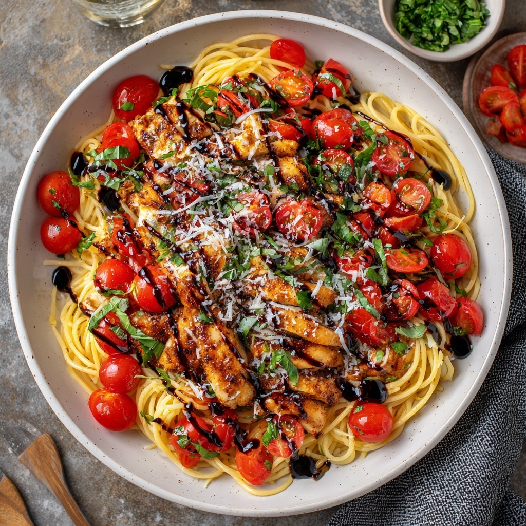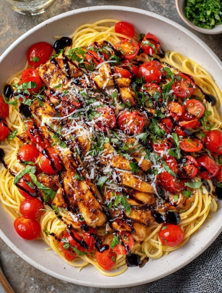 Imagine this: tender, herb-crusted chicken resting on a bed of buttery spaghetti that’s been tossed with a gloriously fresh, juicy tomato and basil mixture. The tomatoes get all saucy and vibrant, the garlic does its magical, aromatic thing, and a drizzle of sweet-tangy balsamic glaze ties it all together with a beautiful, glossy bow. It’s the kind of meal that tastes like it took hours of simmering and stirring, but the secret is, it’s deceptively simple. We’re talking about bold, craveable flavor without the fuss—which, as you know, is the entire heart and soul of BiteTide. So, tie on your favorite apron, put on some feel-good music, and let’s turn your kitchen into the most delicious corner of Italy.