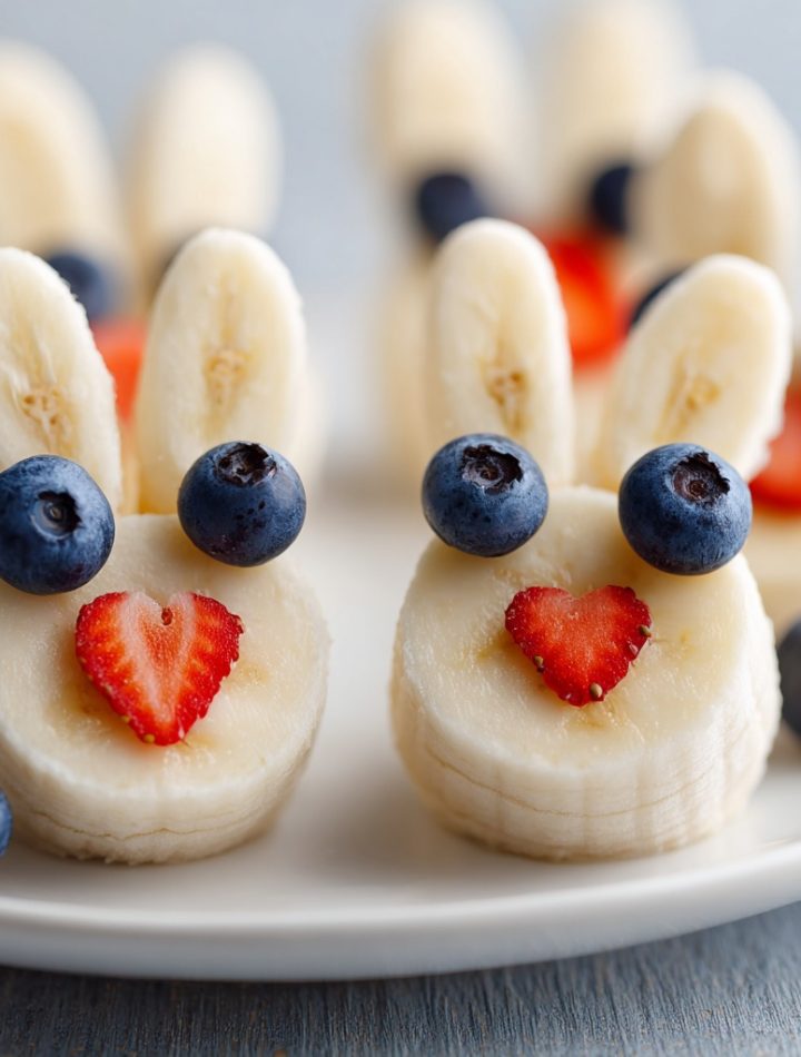 Q: How far in advance can I make these? They brown so fast! A: Bananas and oxygen are not best friends, it’s true! For the very best look, assemble them no more than 30 minutes before serving. If you need to prep ahead, you can toss the banana halves in a very light coat of lemon or pineapple juice (this adds a tiny tang but slows browning), or use the chocolate-dip or yogurt-coat variations which create a protective barrier. Q: My blueberries/Strawberries won’t stick! Help! A: This is the most common “issue,” and it has a simple fix: edible glue! That tiny dab of nut butter, yogurt, or even a dot of honey (for kids over 1) works miracles. You can also use the flat side of a toothpick to make a small indent in the banana first, giving the berry a place to sit. Q: Can I make these for a school event that needs to be nut-free? A: Absolutely! Sunflower seed butter (sun butter) is a fantastic, nut-free alternative for “glue.” For the decorations themselves, stick to fruits, seeds like pumpkin seeds for mouths, or chocolate chips. Q: Any tips for making these with toddlers? A> Yes! Let them be the “executive decorators.” You handle the knife work (slicing bananas, strawberries) and the initial “glue” dabs. Then, give them a bowl of blueberries and let them place the eyes and noses. It might not be symmetrical, and that’s perfect. They’ll be so proud of their creation.Nutritional Snapshot (Per Serving – 1 Bunny Bite)