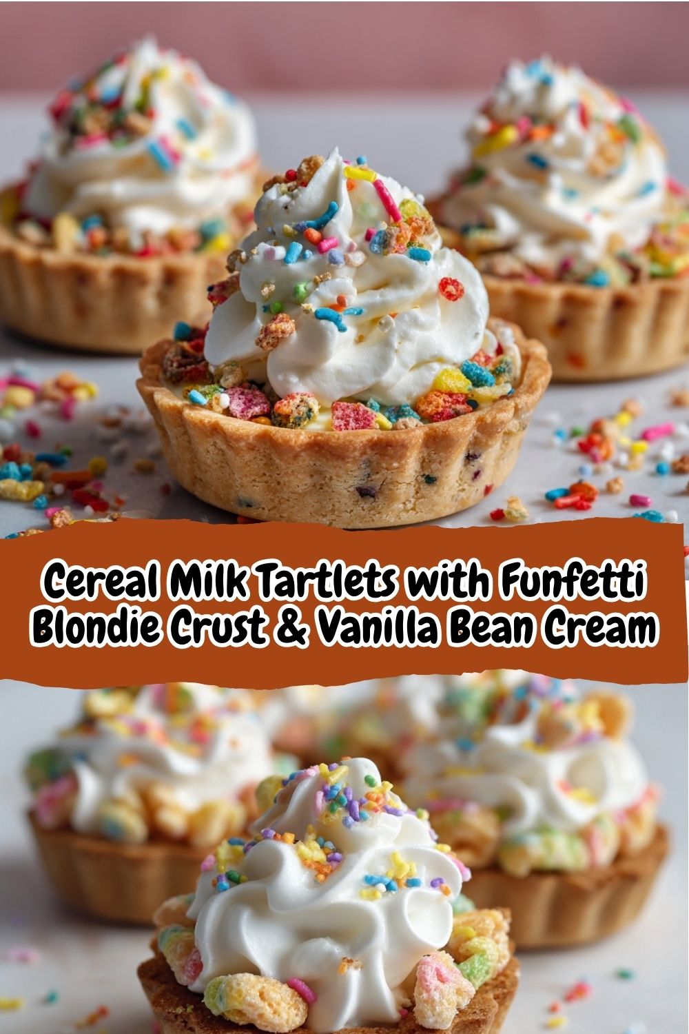 Playful, nostalgic, and unapologetically indulgent, these Cereal Milk Tartlets turn childhood favorites into a bakery-worthy dessert. A soft funfetti blondie crust cradles silky cereal-milk pastry cream, finished with clouds of vanilla bean whipped cream. They’re whimsical, over-the-top, and absolutely unforgettable—perfect for celebrations or whenever you’re craving pure joy.