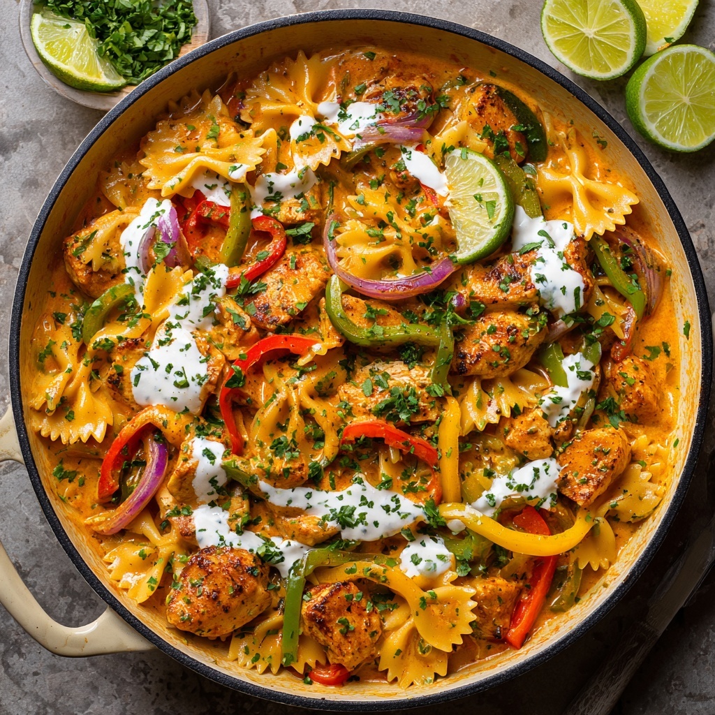 This recipe was born out of pure, unadulterated kitchen chaos, and those are always the best ones, aren’t they? Picture it: a rainy Tuesday, my best friends spontaneously showed up at my door, drenched and laughing. My fridge was… let’s call it “aspirational.” I had some chicken breasts, a rainbow of bell peppers that needed a purpose, and a serious craving for both comfort food and a fiesta. I started making fajitas, but then I saw a box of bow tie pasta winking at me from the pantry. A wild thought crossed my mind: “What if… they joined forces?”