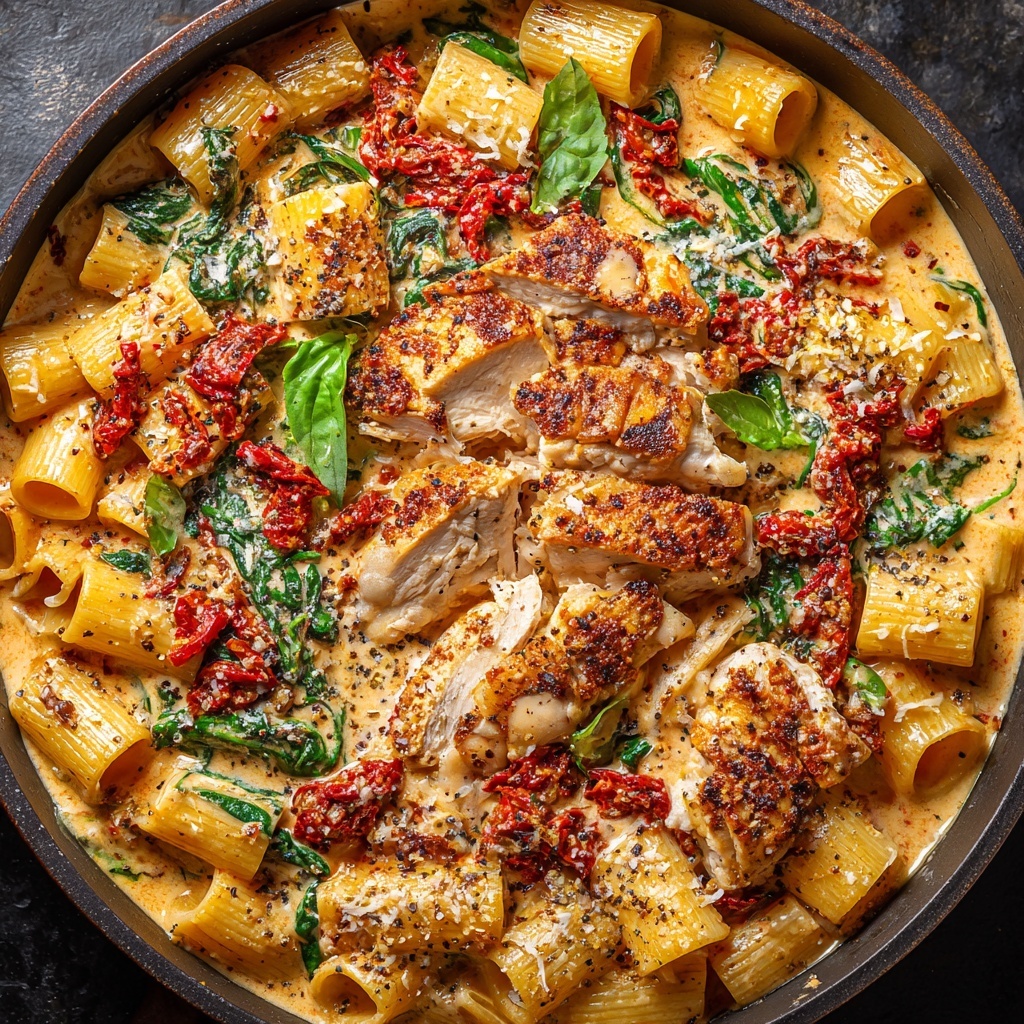 This Creamy Sun-Dried Tomato Chicken Pasta is everything you want in a winter dinner — hearty, satisfying, and made in just one pot. Italian-seasoned chicken is seared to golden perfection, then simmered with rigatoni in a velvety sauce of cream, sun-dried tomatoes, garlic, and spinach. It’s simple enough for a weeknight, yet indulgent enough to feel like a treat. Fewer dishes, bigger flavor, and comfort in every bite.
