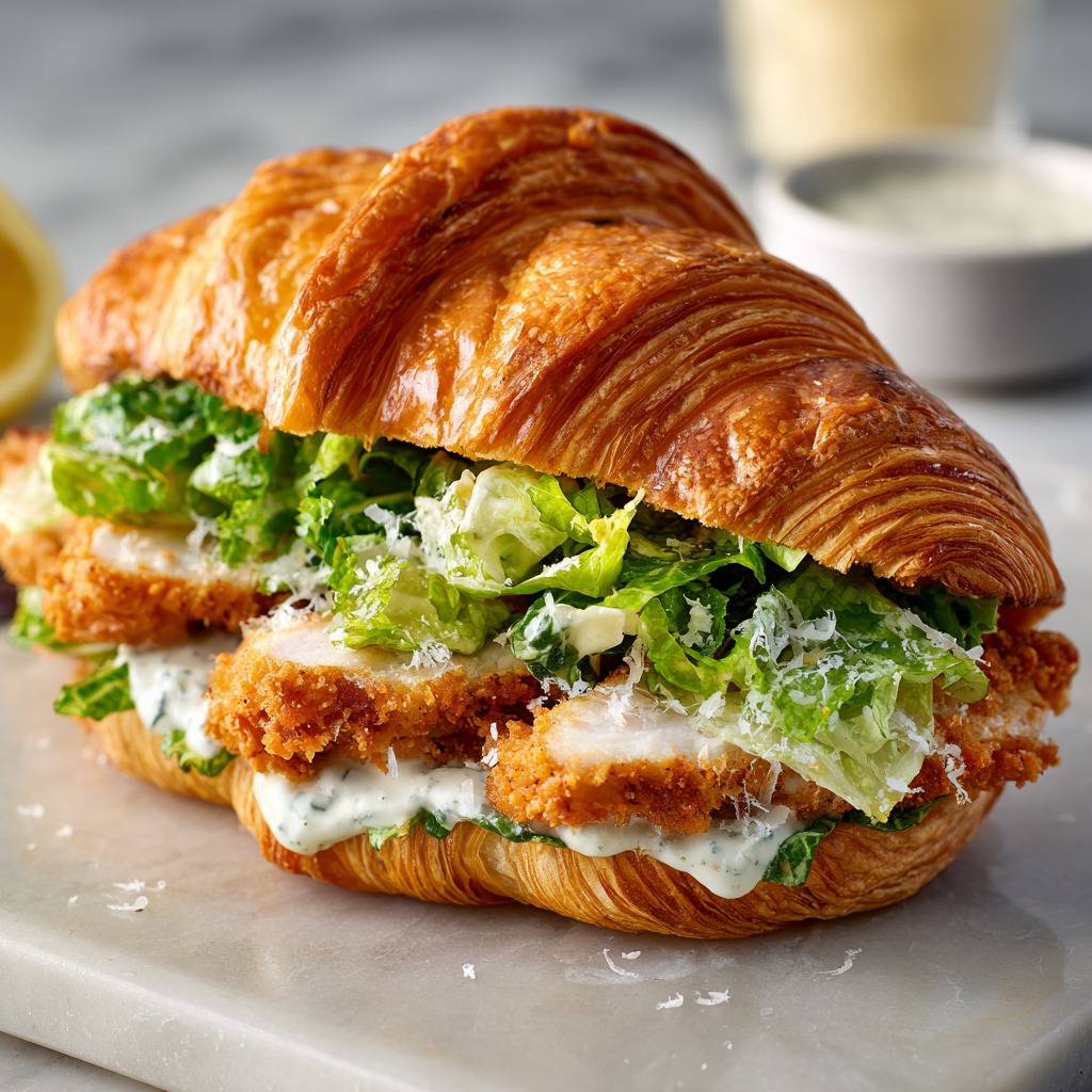 Let’s be real for a second. Some days, you don’t just want a sandwich. You want an experience. You want that first bite where your teeth crack through a shatteringly crisp, golden crust into juicy chicken, then sink into a cool, creamy, garlicky tangle of Caesar-dressed romaine, all hugged by a buttery, flaky croissant that rains crumbs everywhere (the good kind of mess, I promise).