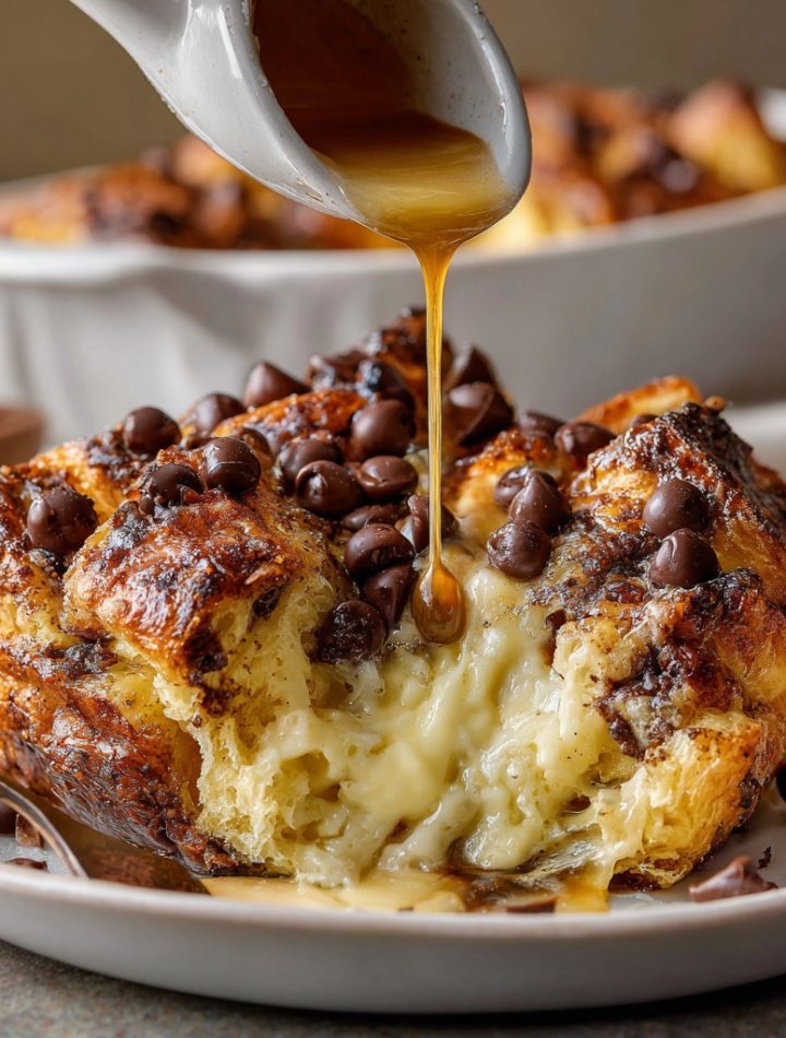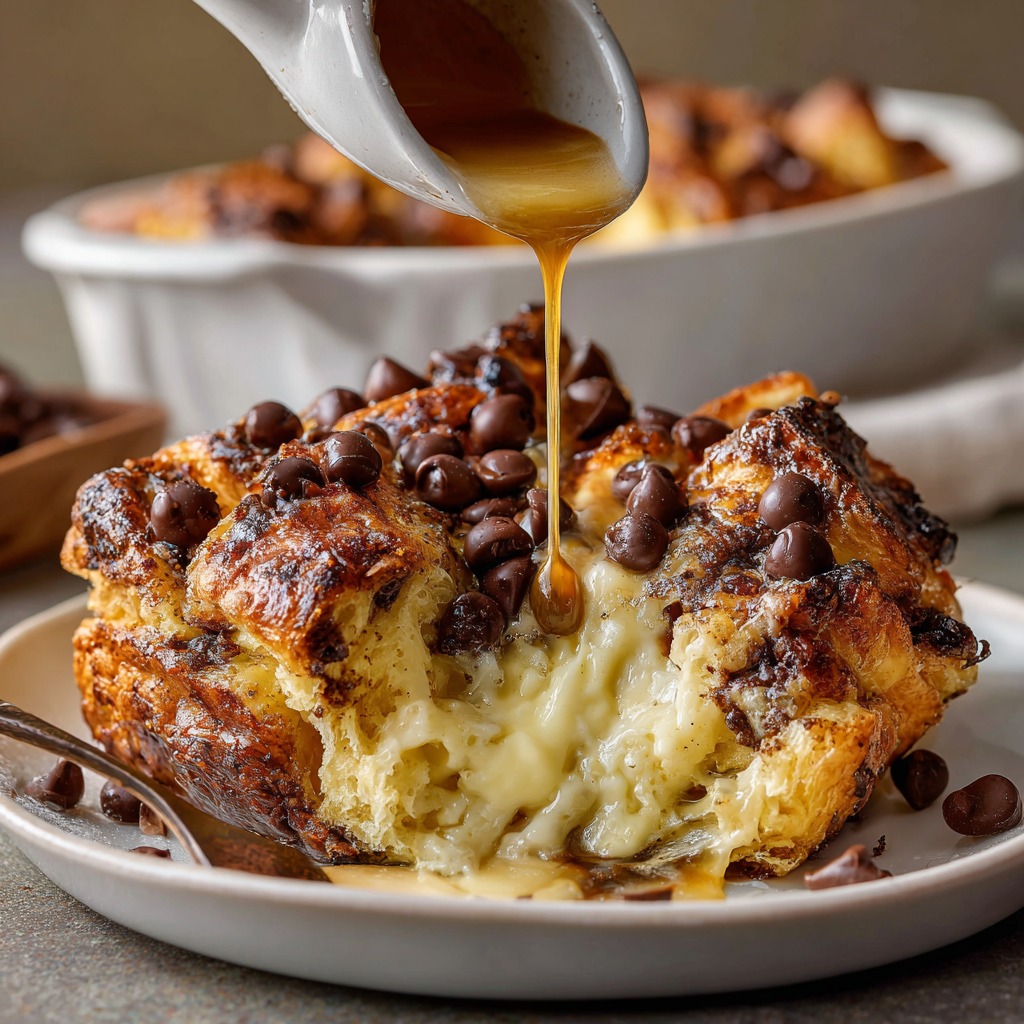A rich and indulgent breakfast bake featuring buttery croissants soaked in a sweet, gooey chocolate custard — perfect for brunch or special mornings.