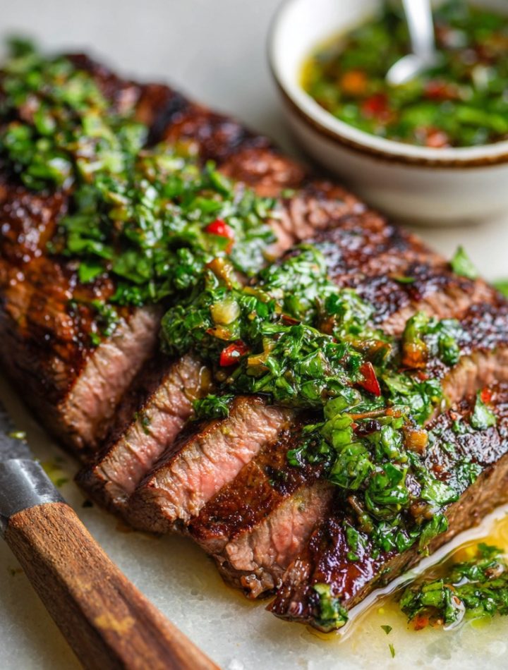 This Chimichurri Steak is vibrant, juicy, and bursting with fresh herb flavor. Tender grilled flank steak gets topped with a garlicky parsley-cilantro chimichurri that’s bright, tangy, and just a little spicy. It’s the kind of meal that feels impressive but comes together fast—perfect for weeknights or weekend cookouts. Fire up the grill and bring bold Argentine flavor to your table tonight!