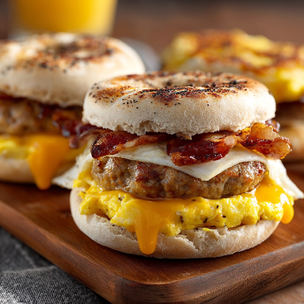- Assemble each sandwich: place the egg on the bottom half, add a sausage patty or Canadian bacon, then a slice of cheese; top with the other bread half.