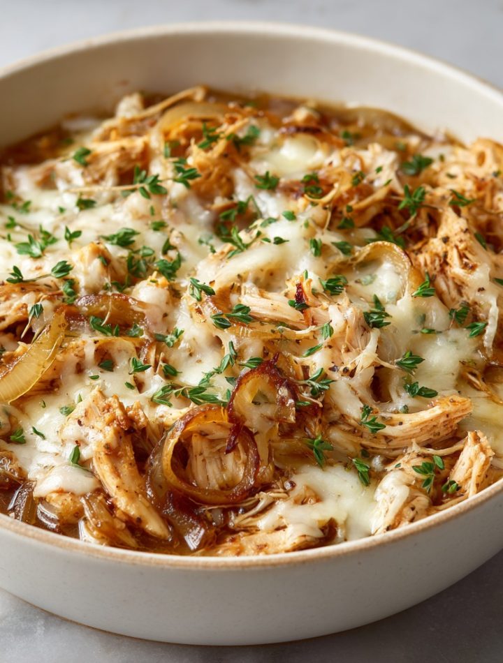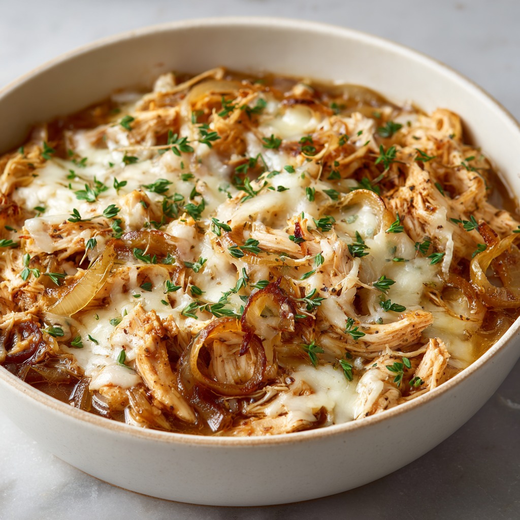 A cozy, lighter twist on French Onion Chicken served in a comforting bowl with caramelized onions, tender chicken, and savory broth over rice or cauliflower rice.