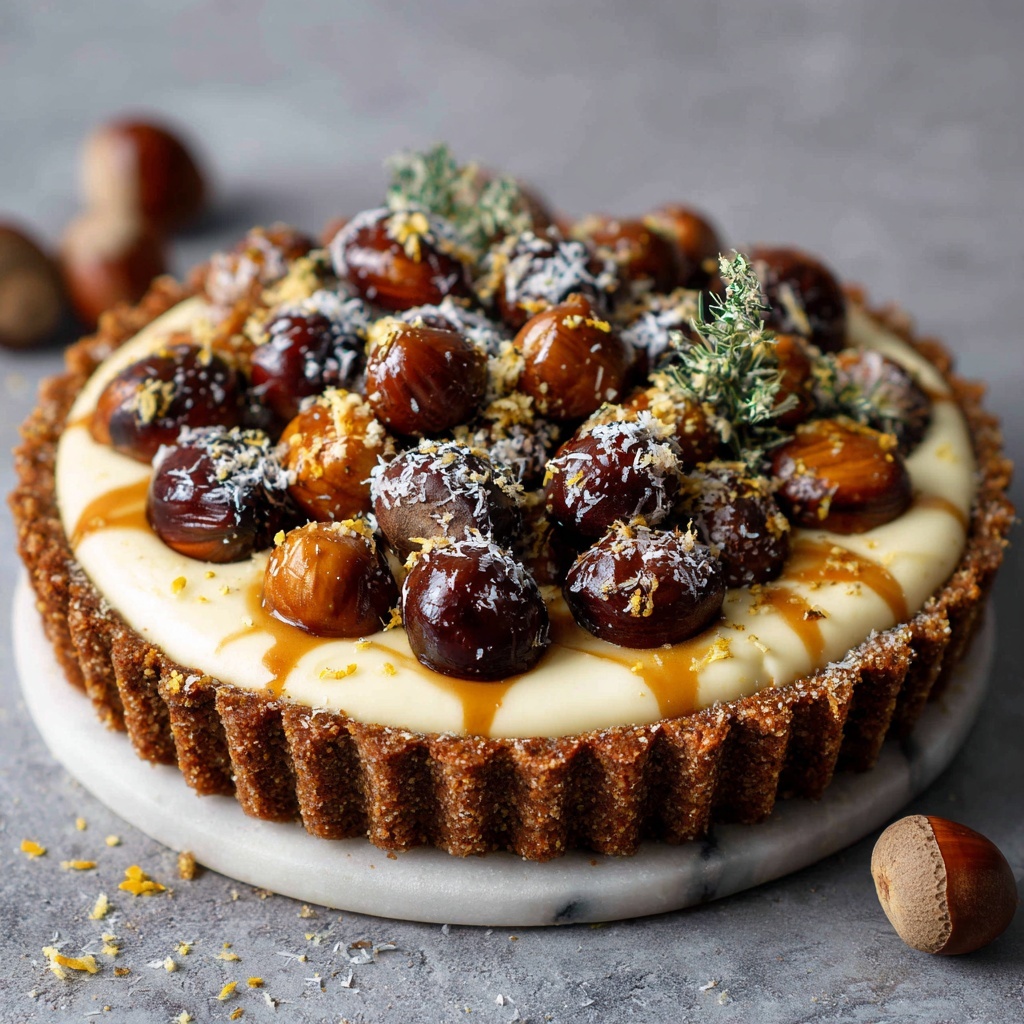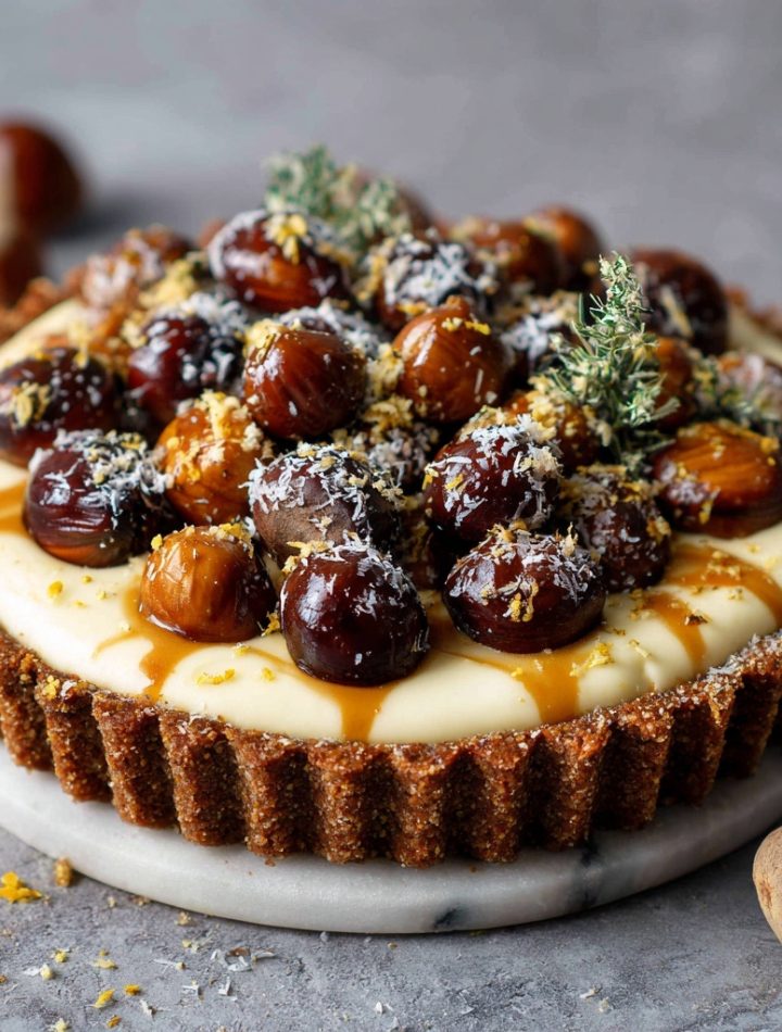 - The Grand Finale: Take your chilled tart out of the fridge. Spoon the warm, caramelised chestnuts over the top, spreading them out in a gorgeous, artful pile. Let that caramel drizzle over the creamy surface. You are now a dessert artist!
