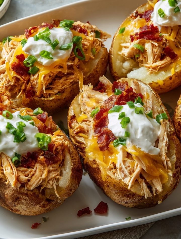• Buffalo Chicken: Mix the scooped-out potato flesh with shredded cooked chicken and buffalo sauce. Fill the skins, top with cheese, and bake. Finish with blue cheese crumbles and chives.