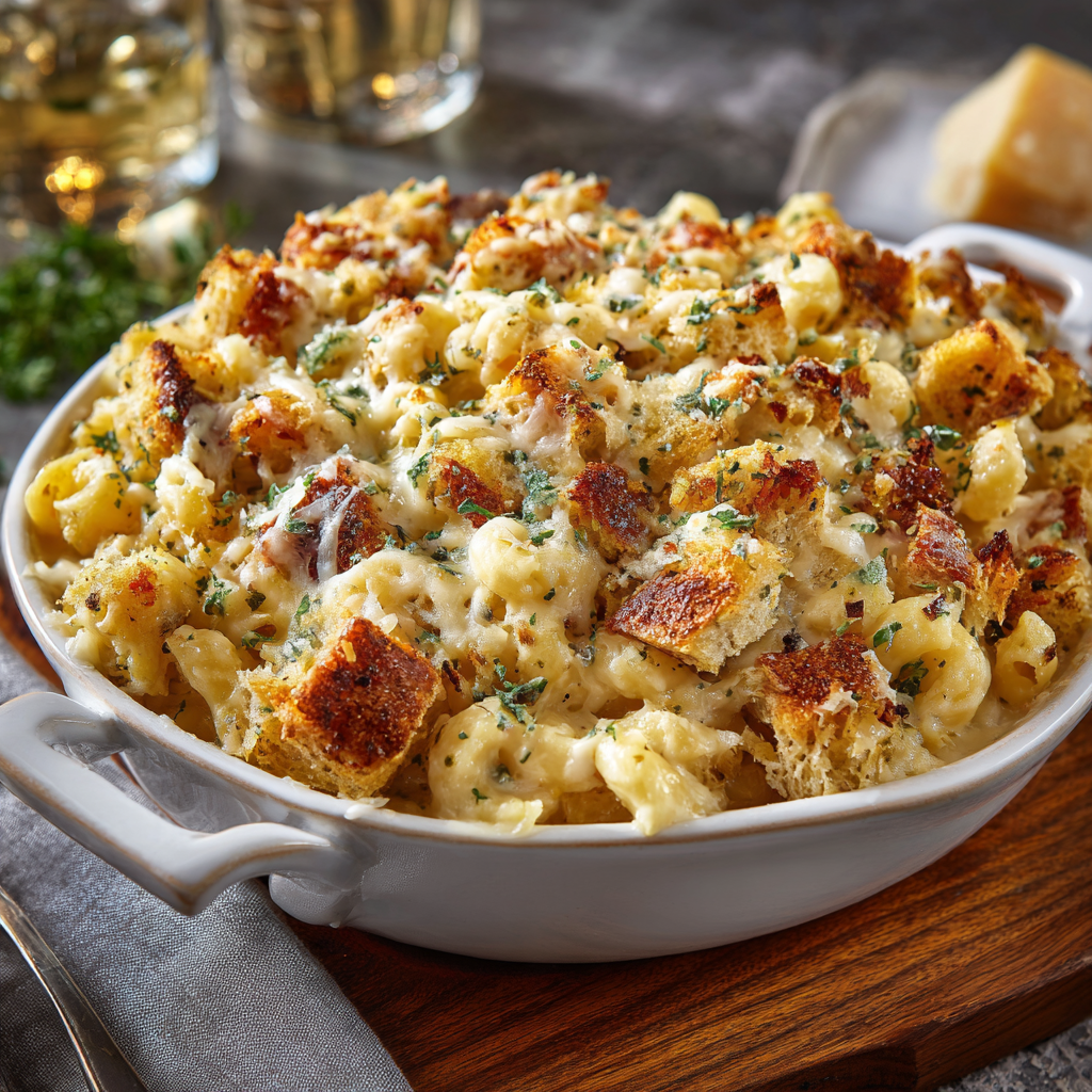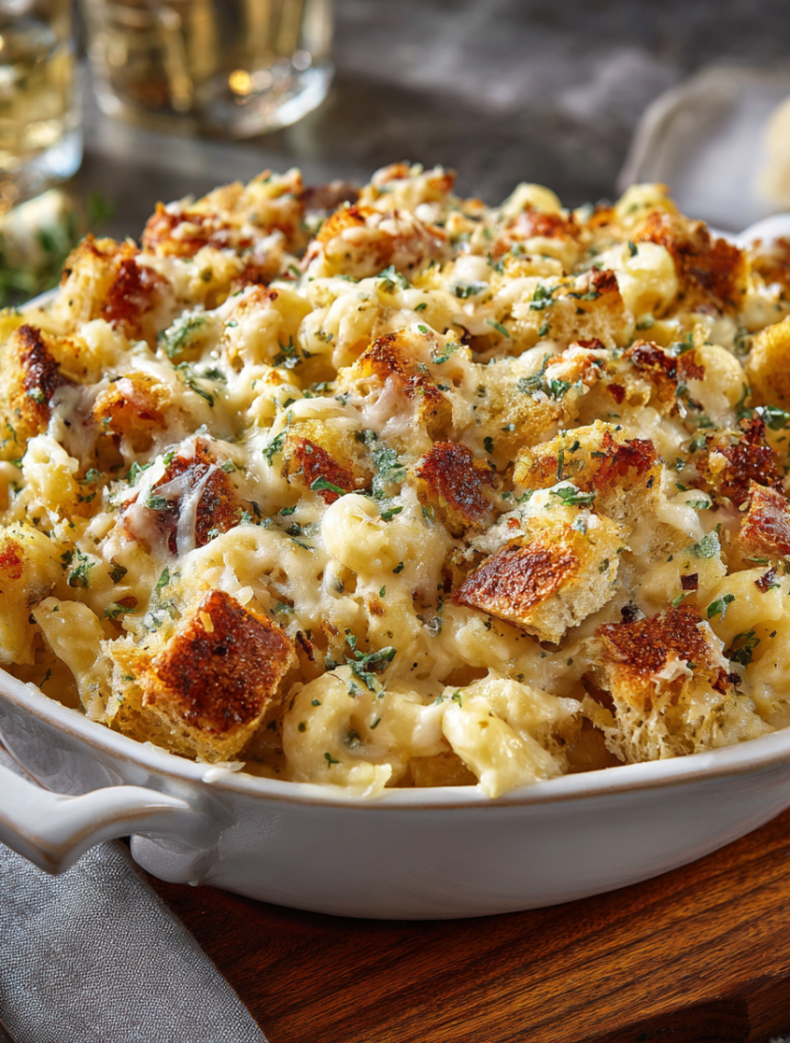 Now, imagine if these two titans of deliciousness decided to join forces. What would that even look like? Well, my fellow flavor fanatics, stop imagining, because I’m about to introduce you to your new favorite recipe: the Mac & Cheese Stuffing Bake. This is the kind of dish that doesn’t just ask for seconds—it demands them. We’re talking creamy, dreamy, ultra-cheesy macaroni, all snuggled up and folded into a savory, herby, perfectly seasoned stuffing. Then, we bake the whole glorious situation until the top is golden and crisp and the inside is bubbling with cheesy joy.
