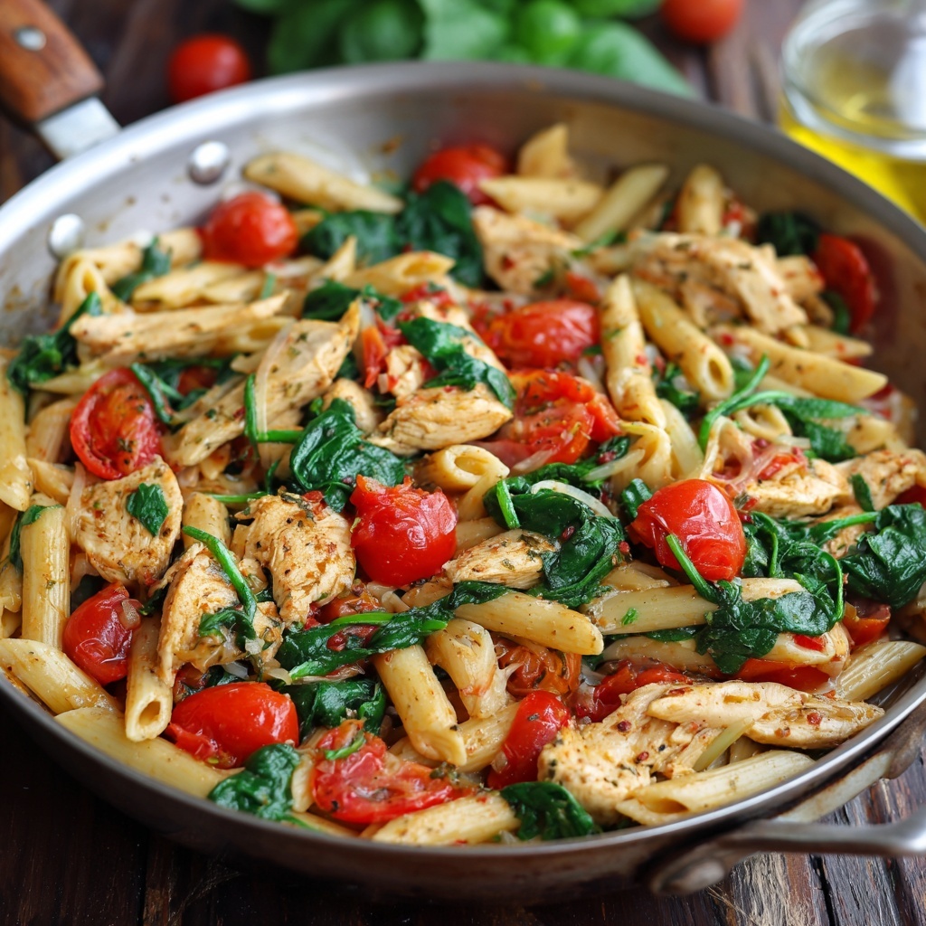 This dish is a complete meal all on its own, but a little presentation goes a long way! I love serving it straight from the skillet at the table for that cozy, family-style vibe. Use tongs to grab a nest of pasta, making sure to get plenty of chicken, tomatoes, and spinach in each serving. Top it with an extra sprinkle of fresh basil and a little crack of black pepper. If you’re feeling fancy, a light grating of Parmesan or a drizzle of high-quality olive oil right at the end is absolutely divine. Pair it with a simple green salad and a slice of crusty bread to soak up any extra sauce—trust me, you’ll want to.