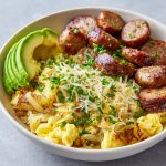 - In a large bowl, whisk eggs with a pinch of salt and pepper. Pour eggs into the sausage‑veggie mixture and gently stir until eggs are cooked through (about 3–5 minutes). Remove from heat.