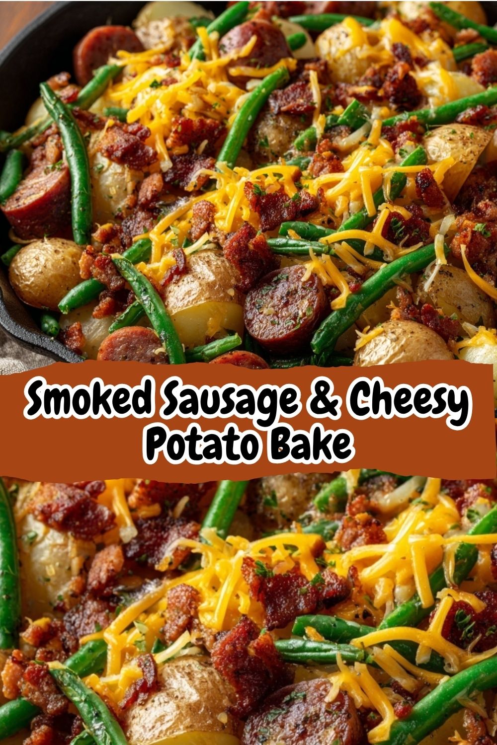 This Smoked Sausage & Cheesy Potato Bake is a hearty one-pan meal loaded with tender potatoes, smoky sausage, green beans, crispy bacon, and melted cheddar cheese. Perfect for busy weeknights or cozy family dinners.