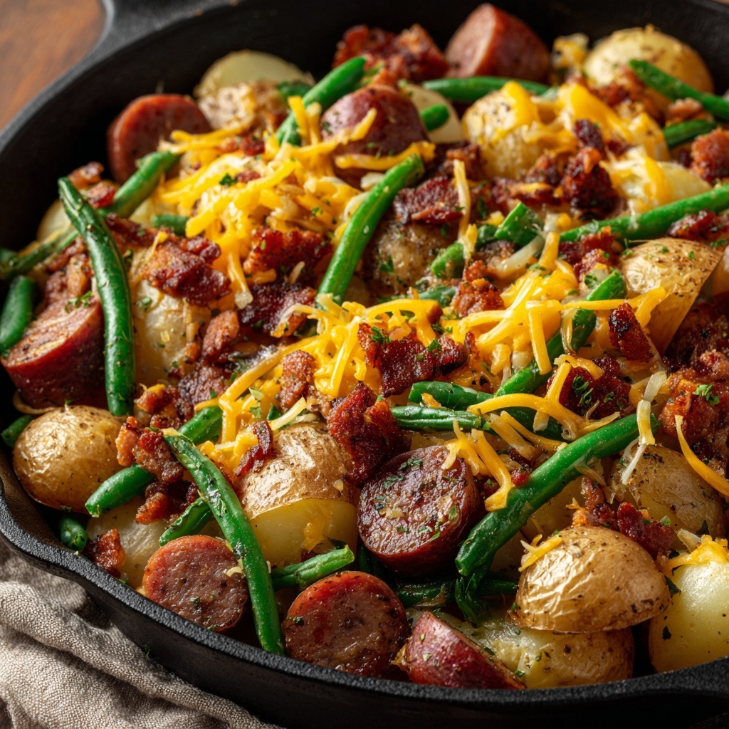 This dish always takes me back to one specific, blustery autumn evening. I was hosting my very first “Friendsgiving” in my tiny apartment. The turkey was taking forever, one of my friends had just announced she was vegetarian (panic!), and my oven decided it only wanted to work at one temperature: vaguely warm. Chaos. I scanned my fridge and pantry with a chef’s desperation—a hodgepodge of potatoes, some smoked sausage from a weekend barbecue, a forgotten bag of green beans, and, thank goodness, a heroic block of cheddar.