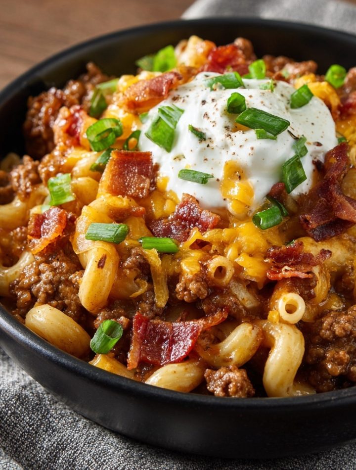 This Smoky Bacon BBQ Cheeseburger Mac is like wrapping your favorite backyard burger in a warm, cheesy hug. Ground beef meets smoky paprika, sharp cheddar, tangy BBQ sauce, and crispy bacon—all stirred into tender macaroni for the ultimate comfort bowl. Topped with scallions and a swirl of sour cream, it’s a cozy cold-weather twist on a summer classic.