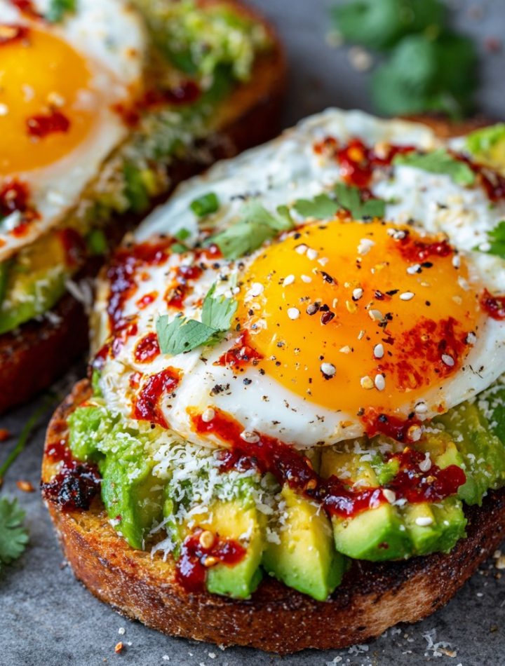 A bold and creamy avocado toast topped with spicy chili‑butter and perfectly cooked eggs — a satisfying and flavorful breakfast or brunch option.