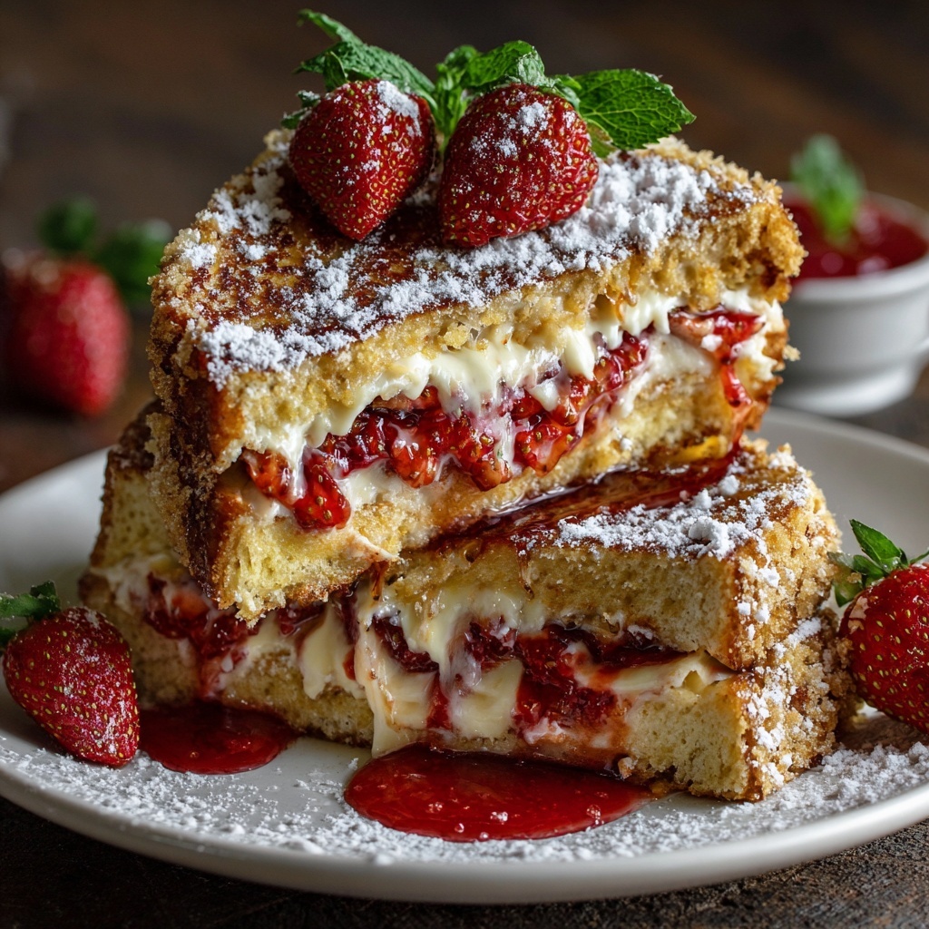 This is the best part! Slide that gorgeous, golden-brown stuffed French toast onto a plate. I like to dust it with a snowstorm of powdered sugar using a fine-mesh sieve for that professional touch. Then, artfully arrange a handful of fresh strawberry slices alongside it. Serve with a small pitcher of warm maple syrup on the side for drizzling, and a truly generous cloud of freshly whipped cream. The contrast of the hot, crisp toast, cool cream, and sweet syrup is a texture and flavor experience you won’t soon forget.