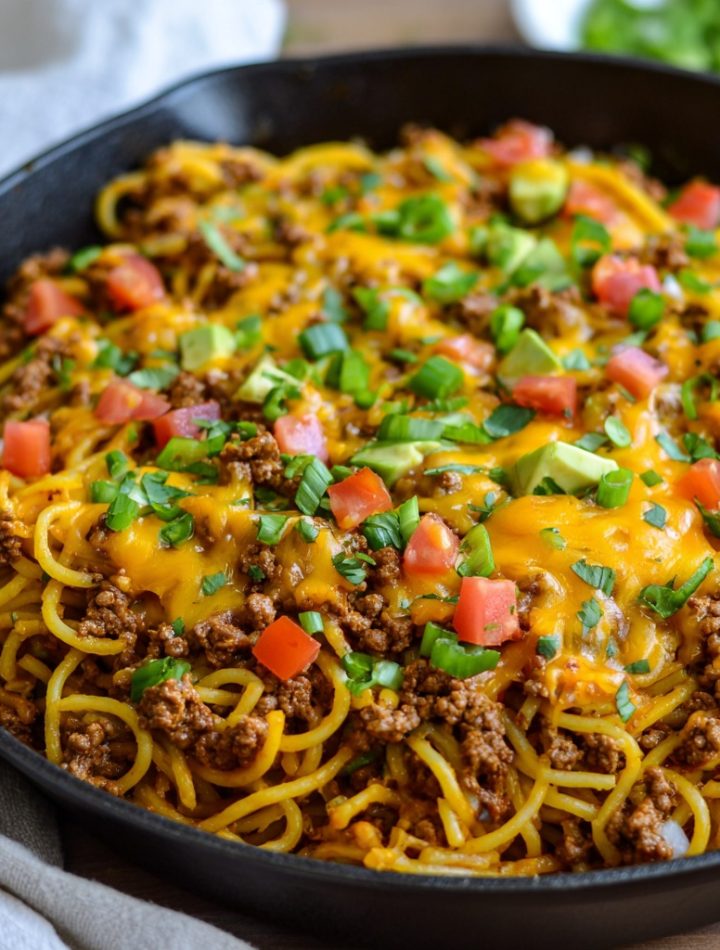 In a moment of what-can-we-lose inspiration, I looked at the taco seasoning packet on the counter and the box of spaghetti in the pantry. “What if…” I thought. I browned the beef with onions, shook in that familiar seasoning, and instead of taco shells, I poured in broth and broke spaghetti right into the skillet. The smell alone brought everyone to the kitchen. When I lifted the lid to stir in a mountain of cheddar, the cheers were instant. That night, we didn’t just solve a dinner debate; we created a new family legend. It was messy, it was joyful, and it proved that the best recipes often come from listening to the chaos and saying, “Let’s try it.”