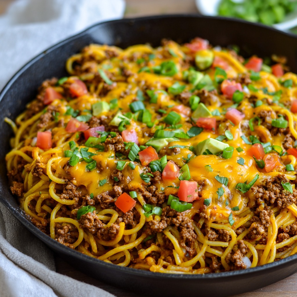 Keywords: taco spaghetti, one-pot dinner, cheesy taco pasta, weeknight comfort food, fusion recipe
