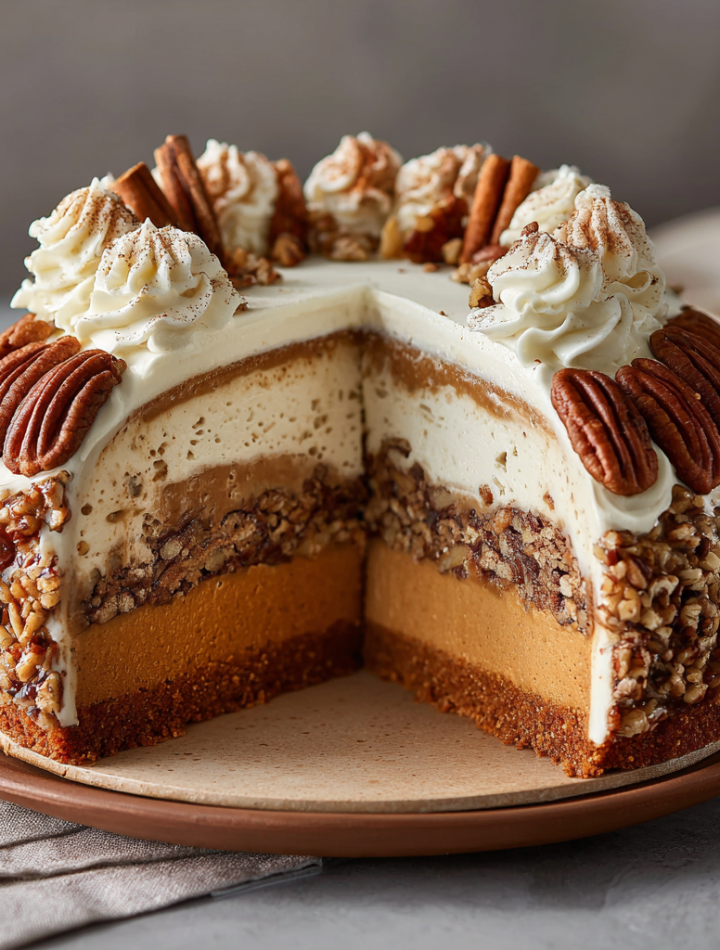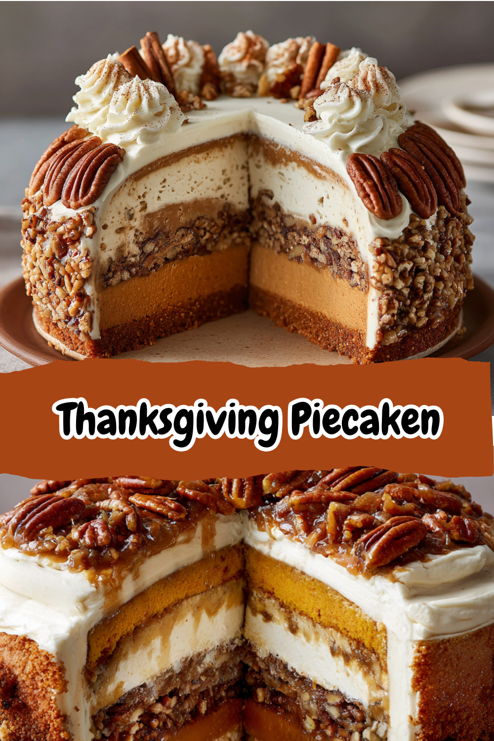 Torn between pecan pie, pumpkin pie, and spice cake this Thanksgiving? Why choose. This Piecaken brings together all the classics into one stunning layered dessert. With rich pecan pie on the bottom, creamy pumpkin pie in the middle, and fluffy spice cake on top—frosted with a cinnamon cream cheese dream—this is the kind of dessert that turns heads and gets talked about long after dinner is over.