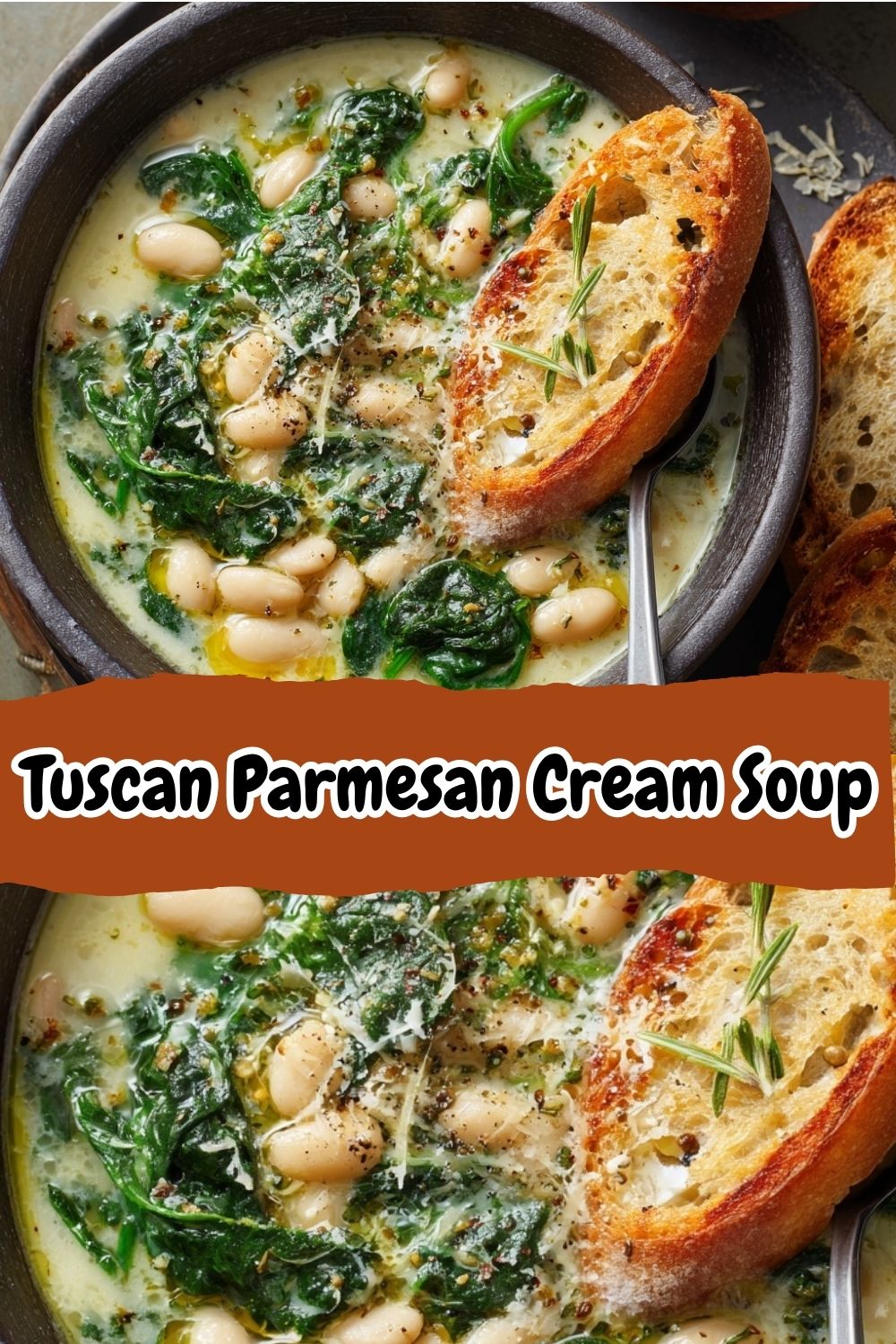 Keywords: Tuscan Parmesan Cream Soup, creamy Tuscan soup, white bean Parmesan soup, spinach cannellini bean soup, comforting creamy soup recipe
