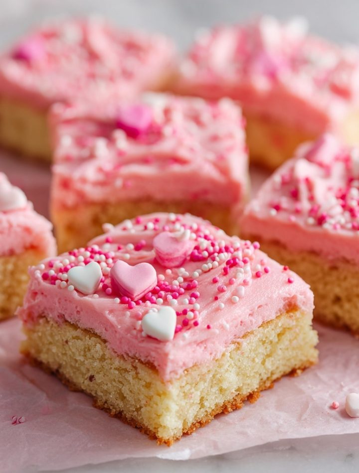 9. Frost & Celebrate: Once the base is 100% cool, spread the pink buttercream evenly over the top. Immediately shower it with heart sprinkles so they stick. For clean cuts, you can even pop the whole pan in the fridge for 15-20 minutes to let the frosting set a bit.